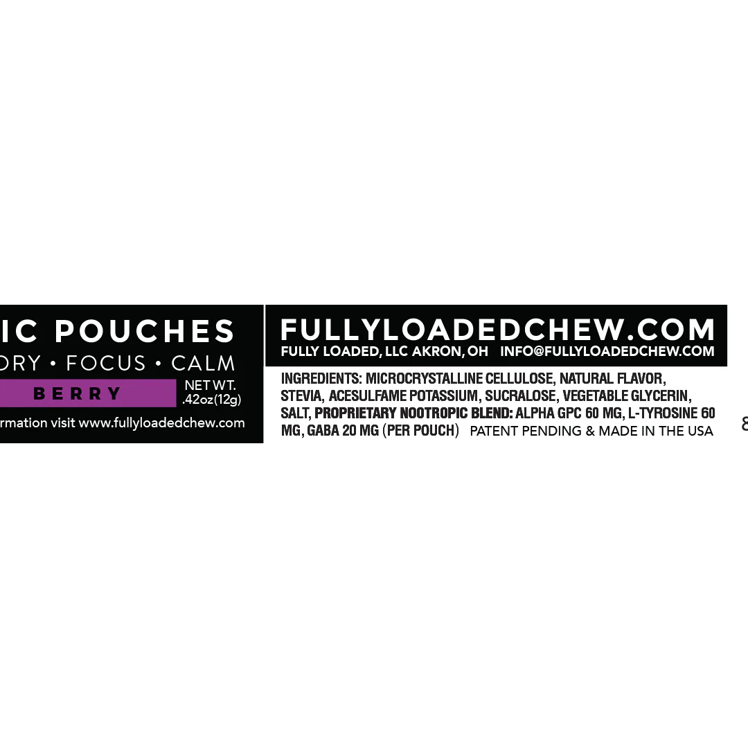 Ingredients: Microcrystalline Cellulose, Natural Flavor, Stevia, Acesulfame Potassium, Sucralose, Vegetable Glycerin, Salt, Proprietary Nootropic Blend: Alpha GPC 60 mg, L-Tyrosine 60 mg, GABA 20 mg (Per pouch)