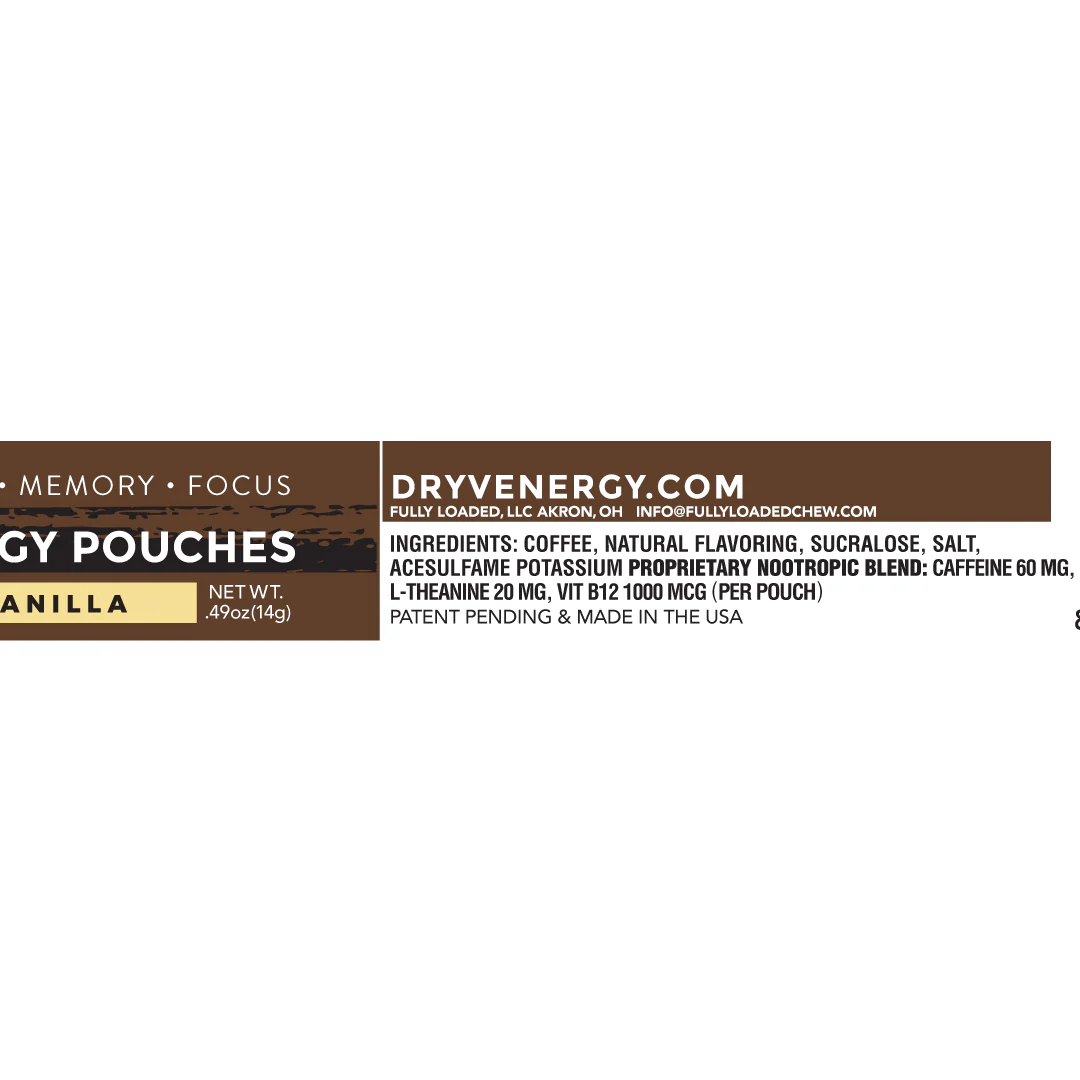Dryv Energy Vanilla Pouches give you a sweet, silky, balanced experience made with blended coffee and our proprietary nootropic energy blend. Each pouch contains 50mg of caffeine (equivalent to 1/2 cup strong coffee), L-THEANINE and Vitamin B12, zero sugar and only one calorie. These caffeine pouches will give you the boost you need to get through the day!